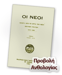 Οι νέοι. Εκλογή από το έργο των νέων Ελλήνων ποιητών 1910-1920, Επιμέλεια Τέλλου Άγρα, Εν Αθήναις, Εκδοτικός οίκος «Ελευθερουδάκης» 1922, σελ. 256.