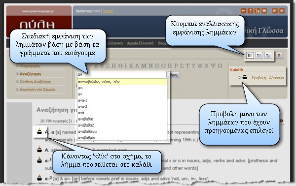 Το πρώτο χαρακτηριστικό του λεξικού που συναντάτε όταν επιχειρείτε μια αναζήτηση είναι ο "κυλιόμενος πίνακας" (drop-down) με όλους τους λεξικούς τύπους που ξεκινούν από το γράμμα που έχει πληκτρολογηθεί. Για κάθε γράμμα που προστίθεται, γίνεται περιορισμός των λημμάτων που εμφανίζονται.