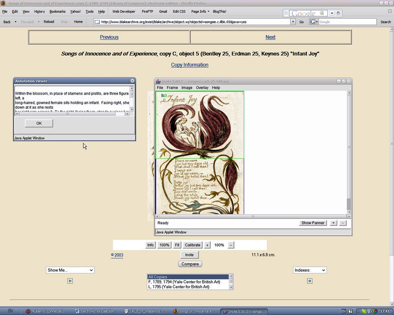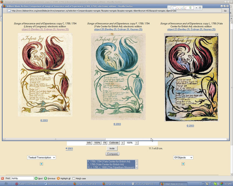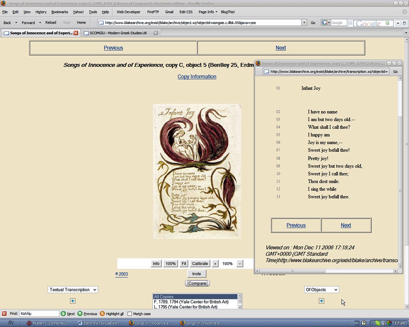 [ 7] Ηλεκτρονική έκδοση ενός έργου του William Blake, με μεταγραφή του κειμένου σε χωριστό παράθυρο à http://www.blakearchive.org/exist/blake/archive/object.xq?object...