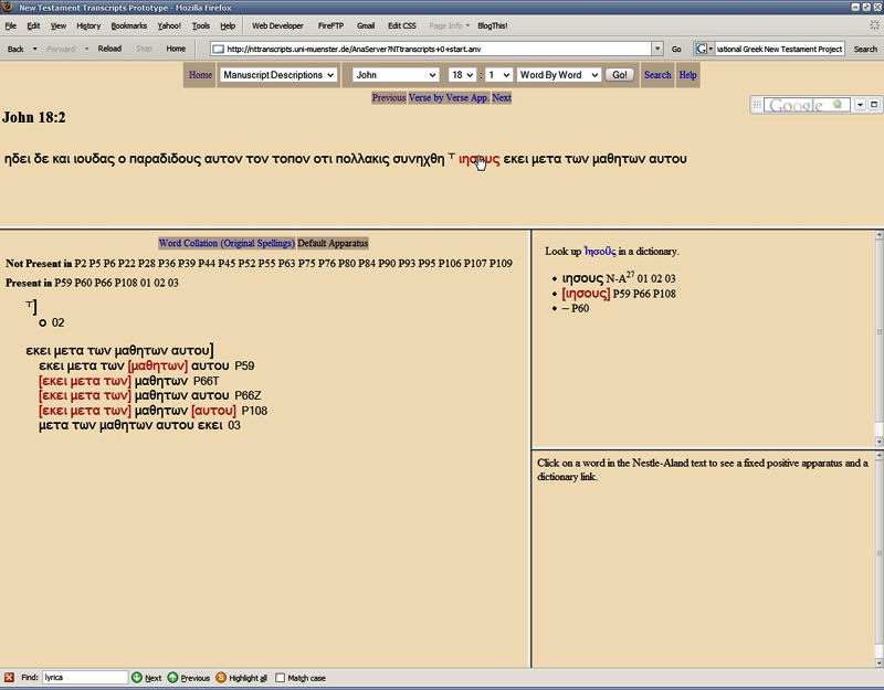 [ 6] Σύγκριση μαρτύρων (collation) λέξη προς λέξη για τον στίχο 18.1 του Κατά Ιωάννην à http://nttranscripts.uni-muenster.de/AnaServer?NTtranscripts+0+s...