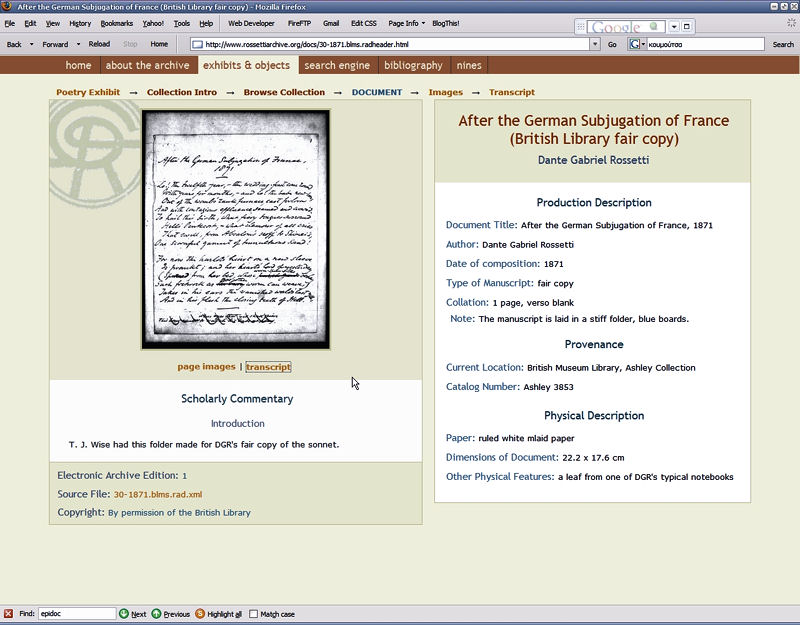 [ 1a] Παράδειγμα για την παρουσίαση ενός τεκμηρίου από το αρχείο Rossetti à http://www.rossettiarchive.org/docs/30-1871.blms.radheader.html