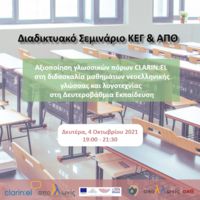 Διαδικτυακό Σεμινάριο του ΚΕΓ: Η αξιοποίηση γλωσσικών πόρων της Εθνικής Υποδομής CLARIN:EL στη διδασκαλία μαθημάτων νεοελληνικής γλώσσας και λογοτεχνίας στη Δευτεροβάθμια Εκπαίδευση (με έμφαση στο Λύκειο) (4/10/21)